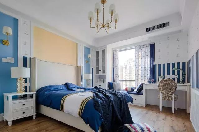 男孩房進門左邊一組多功能柜,適合書籍、玩具的收放。男孩房的藍色,來自海洋的顏色,是不是喚醒了每一個男孩的航海夢呢?