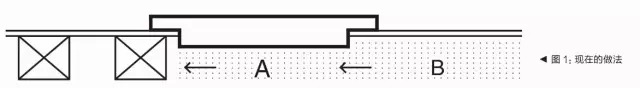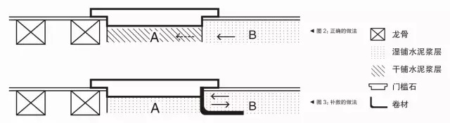 如上圖所示,當(dāng)A區(qū)與B區(qū)均同時采用濕鋪泥沙漿層再后放門檻石的施工流程時,A區(qū)與B區(qū)之間的水泥空隙會連通,浴室的水就會慢慢一路滲進左側(cè)的龍骨,從而使得上層的地板潮濕、發(fā)黑。而正確的施工流程應(yīng)該是,B區(qū)濕鋪,A區(qū)干鋪,最后放門檻石,這樣就會大大降低了地板受潮的可能性。