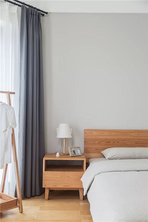 臥室布置簡約之至,木質床架和家具盡顯清晰自然質感,在簡約淺灰的墻面、窗簾、暖灰的床單,打造出舒適的睡眠空間。