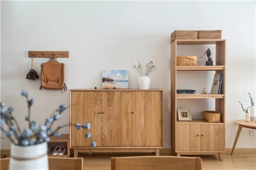 玄關的原木的成品鞋柜、換鞋凳、儲物架皆為一體,排列設計恰到好處,讓人一入門就聞到了原木的自然色彩氣息,讓人感受到家的溫馨。