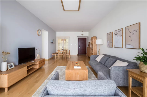 簡單清新的原木打造的素色的空間,明朗淡雅,給人一種清爽舒適之感。電視墻則以淡淡的藍灰色乳膠漆刷新,搭配木色電視柜,擺上些許禪意精致的裝飾,整個客廳都給人以簡單自然的氣息。