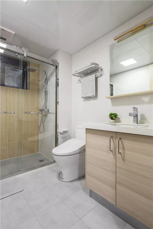 透明的玻璃浴室門將干濕兩區分隔開來,淋浴區的墻面貼上木紋磚,白色與原木色調的搭配的干區,讓小衛生間也顯得自然舒適。