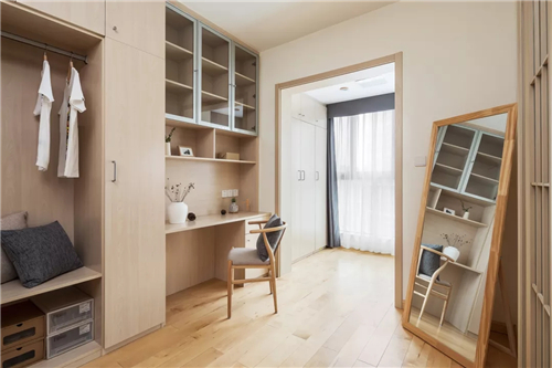 把衣帽間與書房組合成一個空間里,閑置的墻角位置活用為工作區,內嵌式的設計進一步地節省空間,木質書架和書桌簡單又實用,緊扣整個簡約日式風格。靠窗的最里側是衣柜,立一面全身鏡,既顯得有書房的端莊,又有衣帽間的實用優雅。