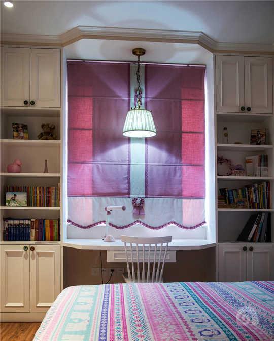 書桌上的吊燈無不透露出精致的感覺,窗簾和床品搭配一點女孩子喜歡的粉色。
