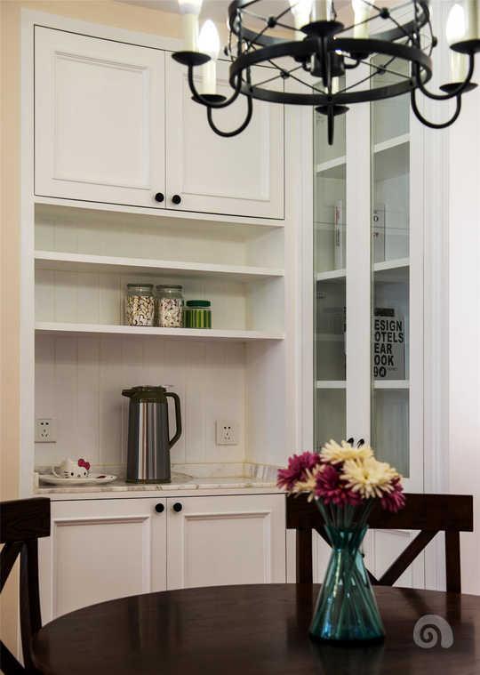 由于餐廳在客廳的縱深部位,所以墻面家具的顏色選擇白色。利用餐廳環(huán)繞的三面墻,分別做了餐廳背景墻,書柜,餐邊柜,書桌工作臺等多功能柜體組合。