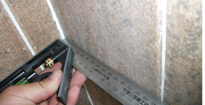 3、用直角尺在瓷磚的陰陽角這么檢驗,允許有3mm的誤差。