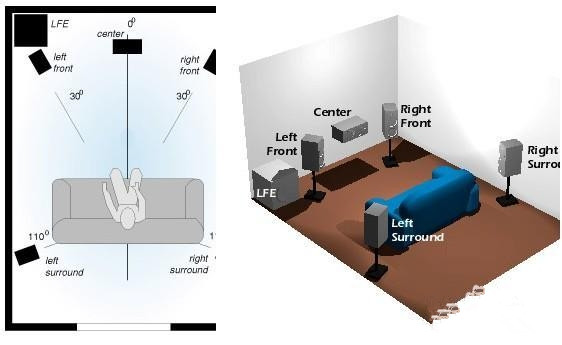 兩個主聲道音箱分別放置在兩側,這樣才有聲場定位感。重低音音箱的位置不是很講究,因為重低音基本上沒有方向性,對于聲場定位不重要。另外兩個環繞音箱分別安放在后方的沙發兩側就可以了,這兩個音箱也很重要,很多聲音效果的聲場定位就靠它們。