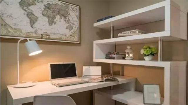 臥室的一角,還設置了一個書桌跟書架,睡前在這里看會書也是個不錯的選擇。