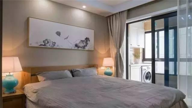 臥室,房梁上安裝了幾個小光源,床頭再放置兩盞臺燈,整體感非常舒適,很適合休息。陽臺安裝玻璃推拉門,臥室就顯得十分明亮。