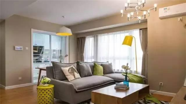 玄關進來就是客廳,地上鋪設一張地毯,邊上一套灰色的沙發,中間還有一張木質的桌子,在柔和的燈光下,整個空間顯得非常溫馨。