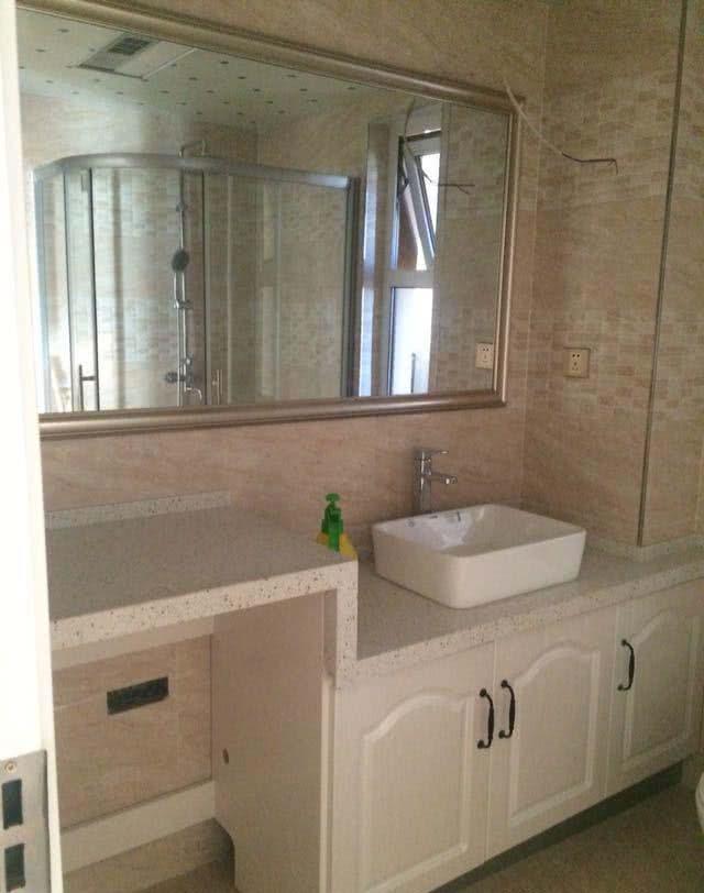 在衛生間里,做著一排柜子,上面的大理石臺面很有層次感。右邊放著一個白色洗手盆,四方形的造型特別獨特,用起來也很方便。這套房子裝修成現在這樣,我就特別喜歡,你是否也喜歡呢?