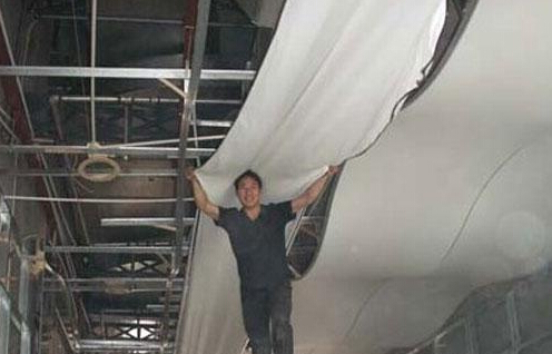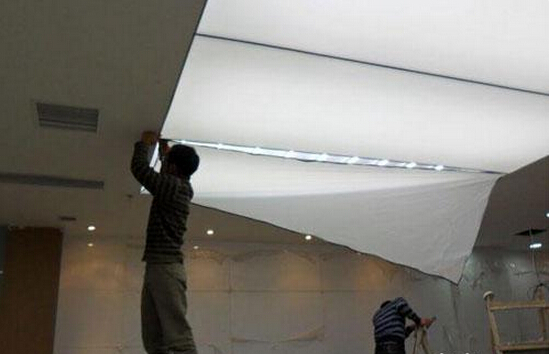 1、當(dāng)所有的安裝軟膜天花的鋁合金龍骨固定好以后,再安裝軟膜。先把軟膜打開用專用的加熱風(fēng)炮充分加熱均勻,然后用專用的插刀把軟膜張緊插到鋁合金龍骨上,最后把四周多出的軟膜修剪完整即可。