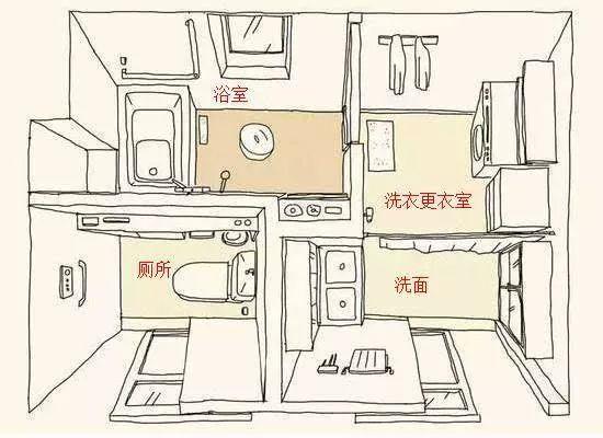 日本住宅的衛(wèi)浴空間,大多是按照上圖「四分離式」來設(shè)計(jì)布局的,浴室、洗衣更衣室、廁所、洗漱間各司其職互不打擾,使用上十分方便。