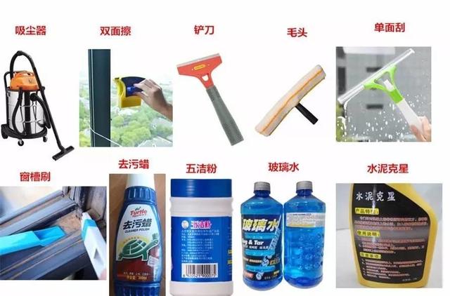 保潔工具有:吸塵器、單面刮、雙面擦、鏟刀、窗槽刷、鋼絲球、毛頭、雞毛撣子、抹布、臉盆、拖把、桶等;