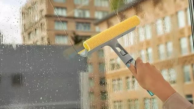 第三步:清理玻璃,用雙面擦及單面刮把玻璃由上往下擦洗干凈,之前還要用窗槽刷把窗槽里面的水泥沙子等東西清理干凈;