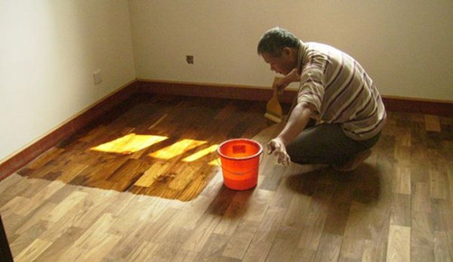 在刮涂膩?zhàn)又螅覀兘酉聛?lái)要對(duì)地板進(jìn)行刷底漆以及調(diào)色處理。因?yàn)閷?shí)木地板的表面紋理是天然的,無(wú)法對(duì)其花色改變,只可以對(duì)地板嚴(yán)肅的深淺進(jìn)行調(diào)節(jié)。
