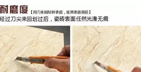 現在的瓷磚在耐磨性上進行了一系列的革新,無論是拋光磚、微晶石、全拋釉、仿古磚之類的,都有一個質的飛躍,那么初步判斷表面是否耐磨,我們只需拿起手中的利刀,盡情地往瓷磚表面刮,看看是否會把瓷磚表面的釉層刮掉,如果連這樣小小的刻劃也不能承受,可以斷定的是,這款瓷磚不是一個能長久陪伴我們的好伙伴。