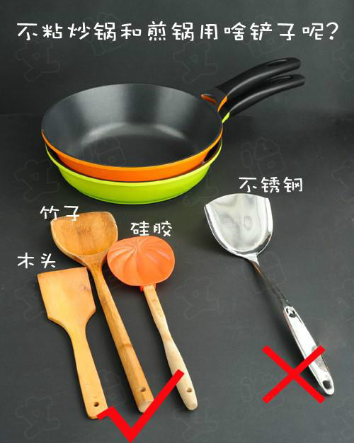 不粘炒鍋,和不粘煎鍋,由于要經常承擔起炒菜和煎炸的重任,炒菜時,需要鏟子在鍋里不斷的翻炒或翻拌,所以呢,我不建議大家使用不銹鋼鏟子。否則,在不斷的,長時間的翻炒過程中,不銹鋼鏟子的尖角兒,容易將內層刮壞。
