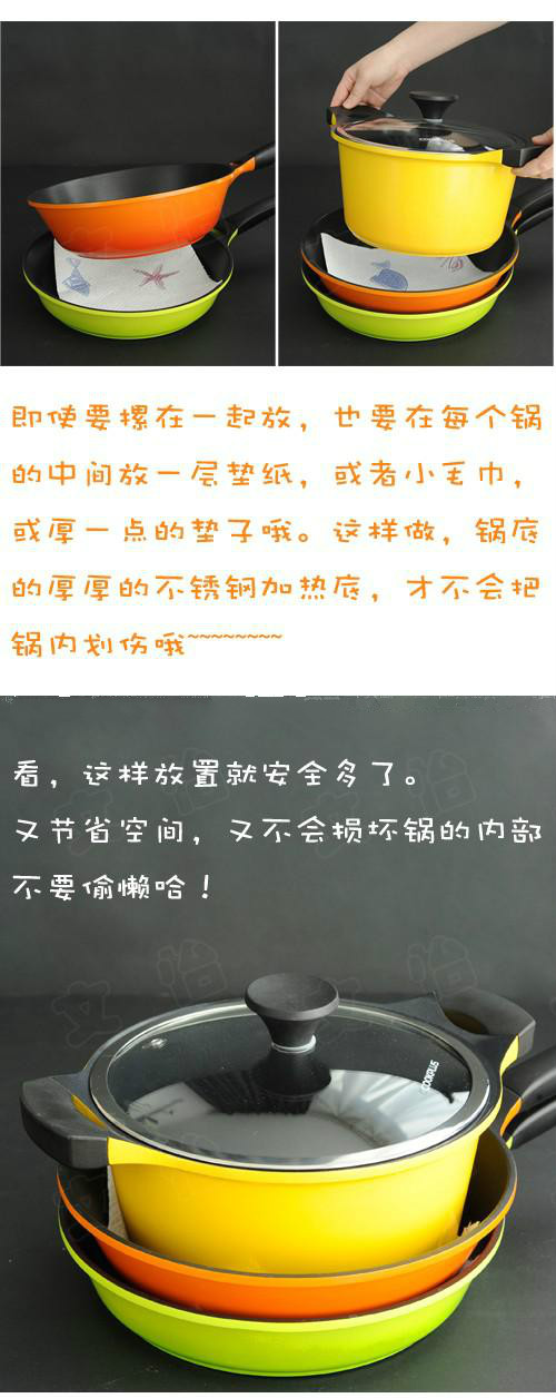“彩色的不粘鍋,你知道第一次使用前,應該怎么保養呢?”“為啥我的鍋沒用幾天,就有劃痕了?”這些問題處理起來都很簡單的,下面,小編就來為大家說說彩色不粘鍋的清潔保養、使用,炊具選擇和收納!