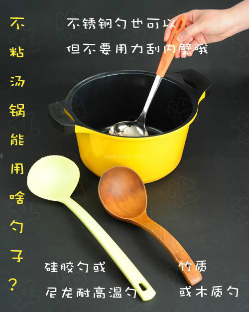 不粘的煮鍋和湯鍋,可以用到硅膠勺子,尼龍耐高溫勺,竹質或木質的勺子都沒問題。那能不能用不銹鋼的勺子呢?