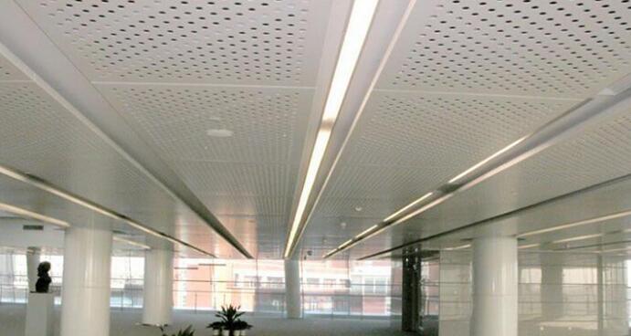 安裝天花鋁扣板時,順著翻邊部位順序輕壓,將方板兩邊完全卡進次龍骨后,再推緊,嚴禁野蠻裝卸;并將邊鋁條卡邊調直卡固定邊鋁板。根據設計要求本工程吊頂采用600mm*600mm沖孔鋁扣板 。