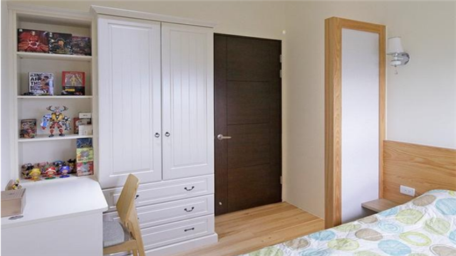 大兒子則因工作緣故較少來此居住,但在規劃上卻不馬虎,而原先入口即可看見床頭位置,因此規劃顧問特別設置一道隔屏,同時在旁拓增小型臺面,不僅能夠將手機、書本放置于此增添更多功能,而小書桌旁接著展示柜衣柜一氣呵成的完成流暢的柜體所需。