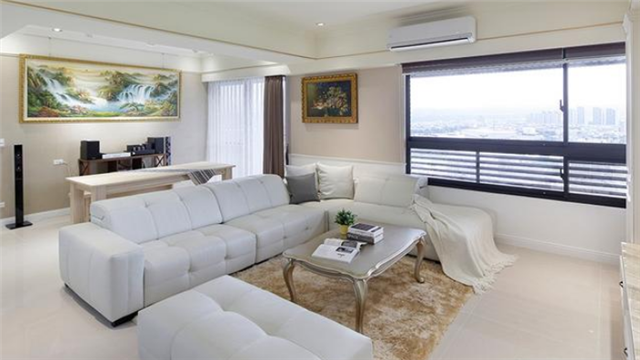 客廳延續玄關簡約清新氛圍,開放式格局以梁柱位置做為餐廳分界,天花板處飾以帶有金粉的涂漆線框,細致的襯托剔透的水晶燈,更散發出高貴氣息,并且挑選灰白色系的皮質沙發,圍塑高雅的品味。