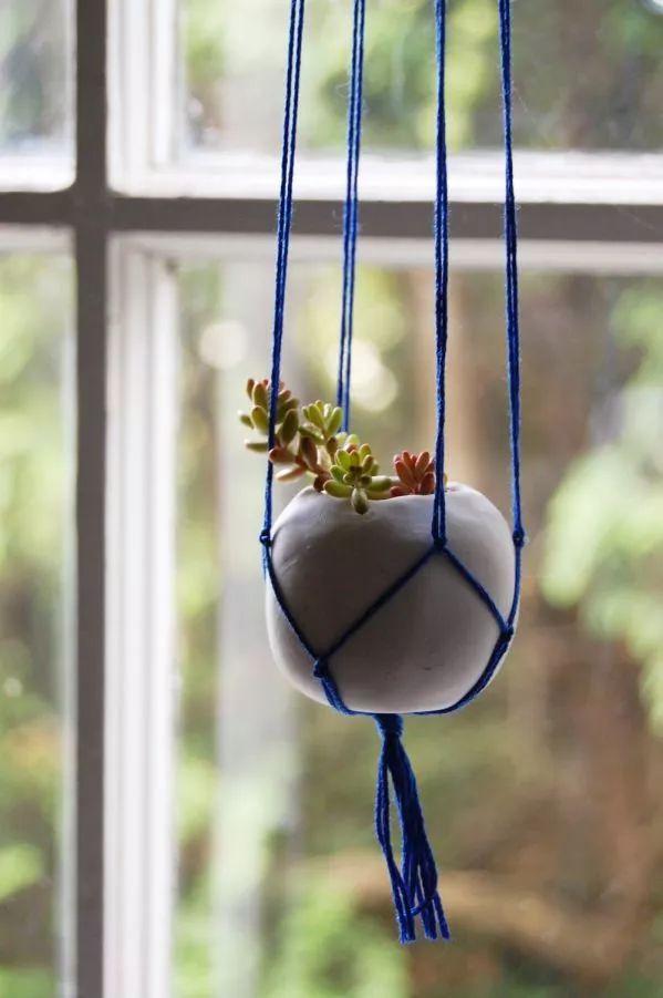 制作這種懸掛起來的植物是非常簡單的,可以直接用一些彩繩制作,可以將幾個彩繩串連起來,可以把花盆直接擺放進去,你可以選擇自己喜歡的顏色,還可以用繩子量身定做,用來擺放不同的花盆,觀賞效果也是不同的。