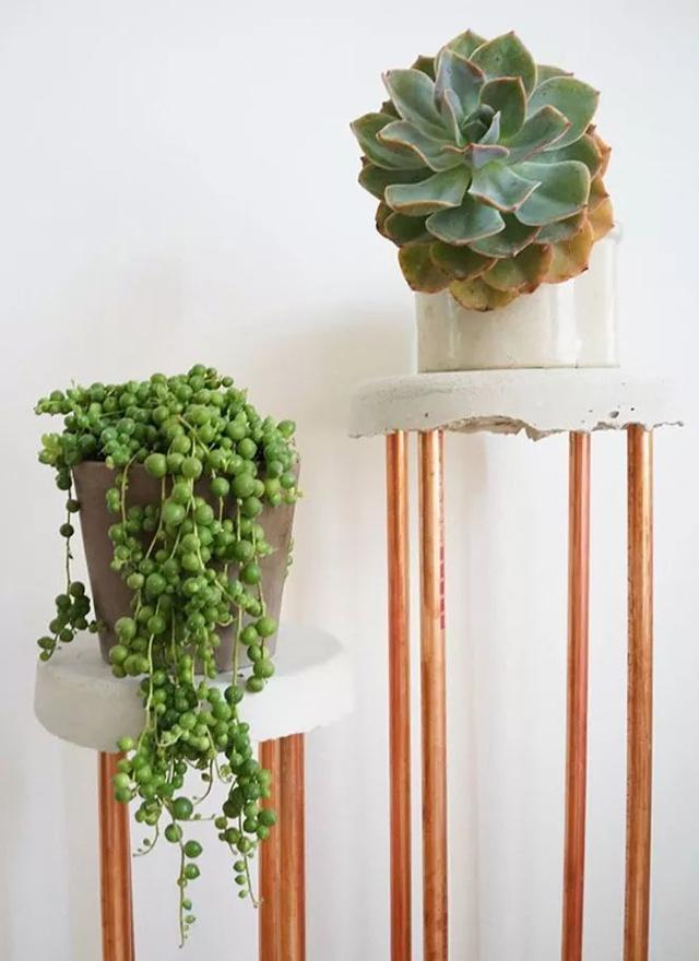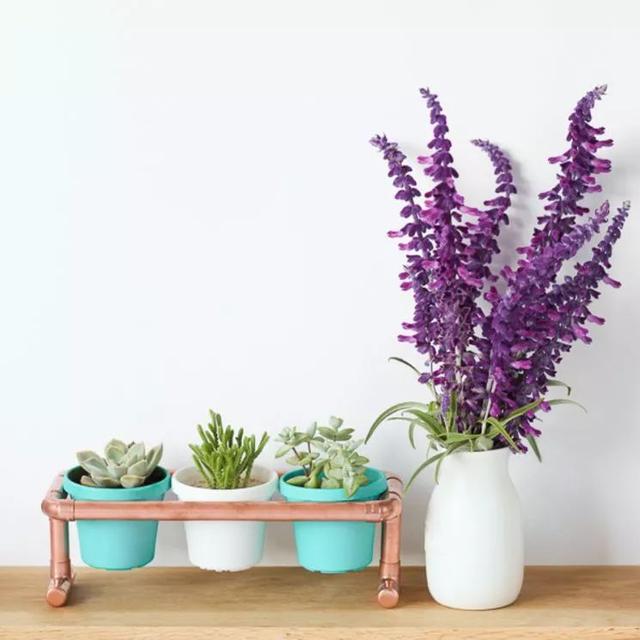 在桌面上布置植物支架就比較困難,因為大部分的花架都是比較大的,如果想要在桌面上擺放一些小盆栽,那最好是自己DIY一個小支架,可以直接用銅管或小水管制作,搭配小多肉盆栽,看著格外清新。