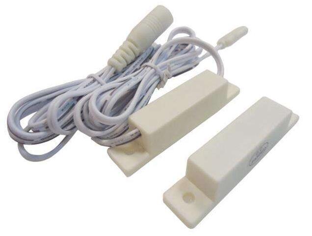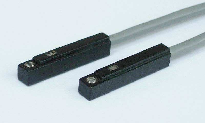 平時,玻璃管中的兩個由特殊材料制成的簧片是分開的。當有磁性物質靠近玻璃管時,在磁場磁力線的作用下,管內的兩個簧片被磁化而互相吸引接觸,簧片就會吸合在一起,使結點所接的電路連通。外磁力消失后,兩個簧片由于本身的彈性而分開,線路也就斷開了。因此,作為一種利用磁場信號來控制的線路開關器件,干簧管可以作為傳感器用,用于計數,限位等等(在安防系統中主要用于門磁、窗磁的制作),同時還被廣泛使用于各種通信設備中。在實際運用中,通常用永久磁鐵控制這兩根金屬片的接通與否,所以又被稱為“磁控管”。
