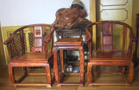 ??? 在明清家具中首選材料是黃花梨木,這種材料顏色不靜不喧,紋理或隱或現,生動多變,黃花梨古無此名,而只有“花梨“,或寫作“花櫚“。后來冠以“黃“字,主要藉以區別現在還大量用來制造家具的所謂“新花梨“。其顯著特點是花紋面上有鬼臉,即樹結子為最佳,花粗色淡者為低。另一特點是其心材和邊材差異很大,其心材紅褐至深紅褐或紫紅褐色,深淺不勻,常帶有黑褐色條紋,其邊材灰黃褐或淺黃褐色。