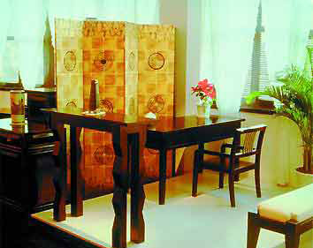 ??? 選用這套家具的人非常中庸穩定。溫和典雅,不只有50年代初期的明快線條,在用色配搭上還有點大和民族格式。沙發上不同布質在選料上非常謹慎,不只為了觸感,也考慮到光線反映出來的質感。特矮的咖啡桌,桌面為橡木自然色,與日本風情擺設配合融洽。旁邊巨型站立屏風,倒是一項品味幽默,你幾乎什么都能夾到屏風上去:書本、賬單、報紙、輕衣物或不能公諸于世的東西,讓它成為廳里的話題。長型站燈,個性柔和,讓人在室內的泛光式明亮中感覺安定溫馨。