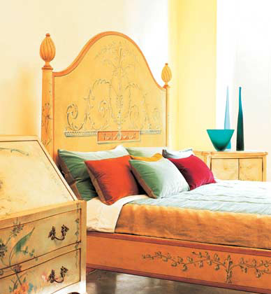 ??? 質感古樸的家具上面有色彩柔和的手繪圖案,傳遞著熟悉親切的古典韻味。將具有古典美的家具搭配色彩和線條頗具現代感的家居飾品,是一種別致而完美的方法。