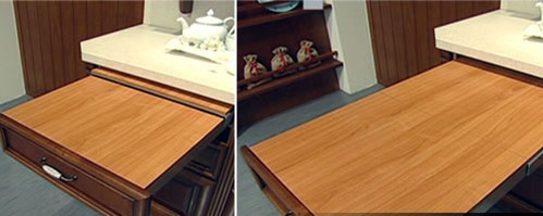 ??? 抽屜因應不同的需求,也發展出各種不同的靈活功能,例如這個櫥柜抽屜,設計為兩截式拉板,全部展開時,就是一個輔助的置物臺面,家庭主婦再也不需要在想有寬敞工作臺與占空間兩難了!不使用時只要輕輕收起,就能還原舒適的活動空間。