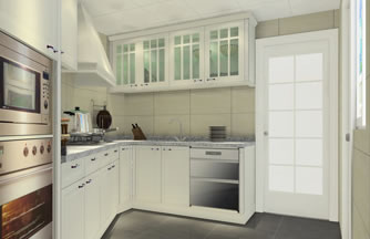 ??? 設(shè)計(jì)說(shuō)明:廚房里墻面有兩個(gè)一大一小的立柱,無(wú)法將有柱子的空間合理的利用,運(yùn)用定制廚柜的特有優(yōu)勢(shì),按柱子凸出的長(zhǎng)、寬將兩個(gè)柱位合理的包在廚柜里,弱化了柱子的凸出感。