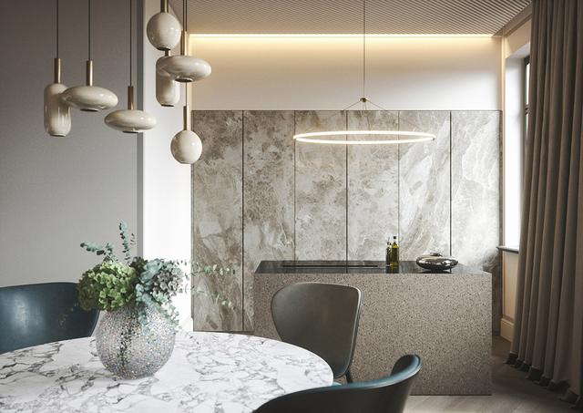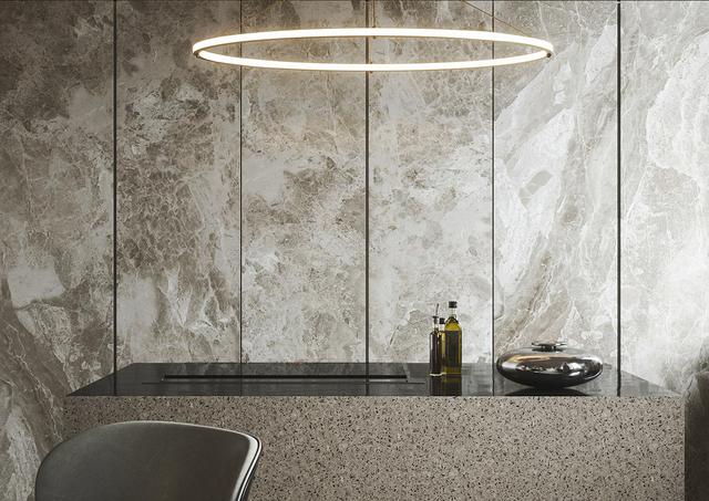 大理石效果的櫥柜門為極簡主義廚房設(shè)計提供了背景。一盞光環(huán)吊燈照射在廚房的一個操作臺上。