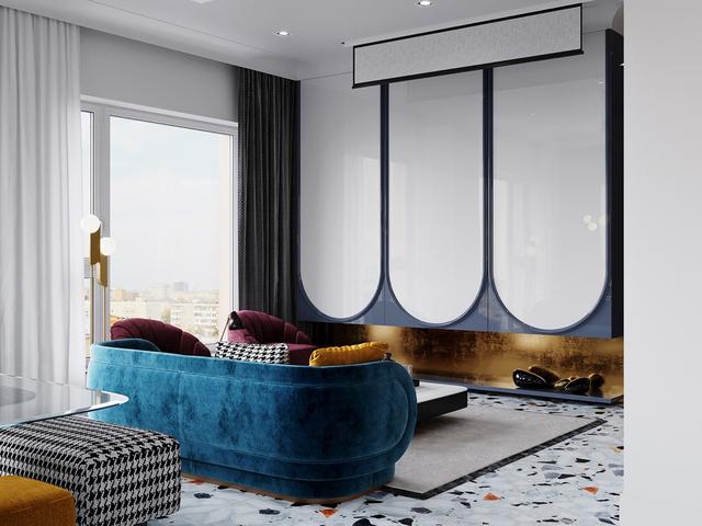 大膽的色彩搭配光滑的材料,大理石,黃金,黃銅,加上裝飾的個人元素,使這個室內(nèi)特別獨特。