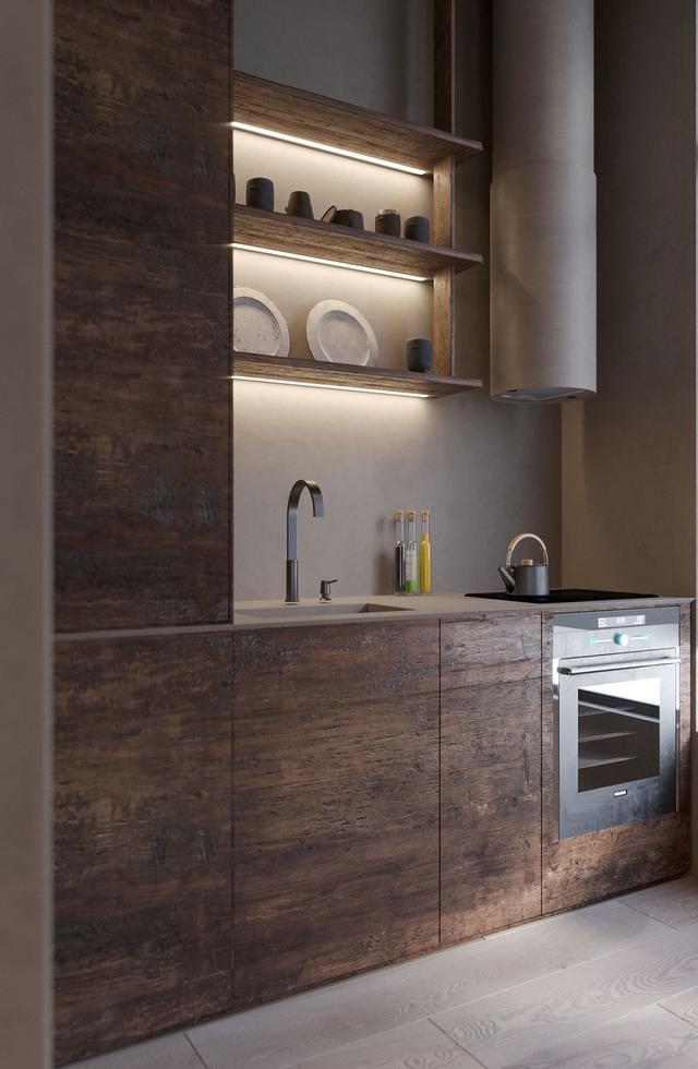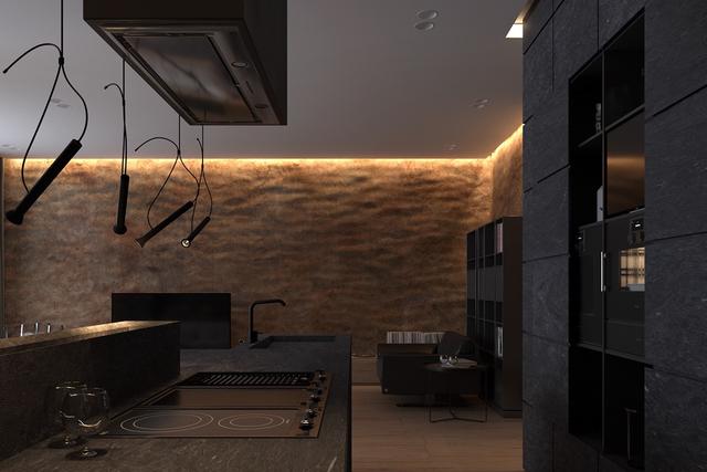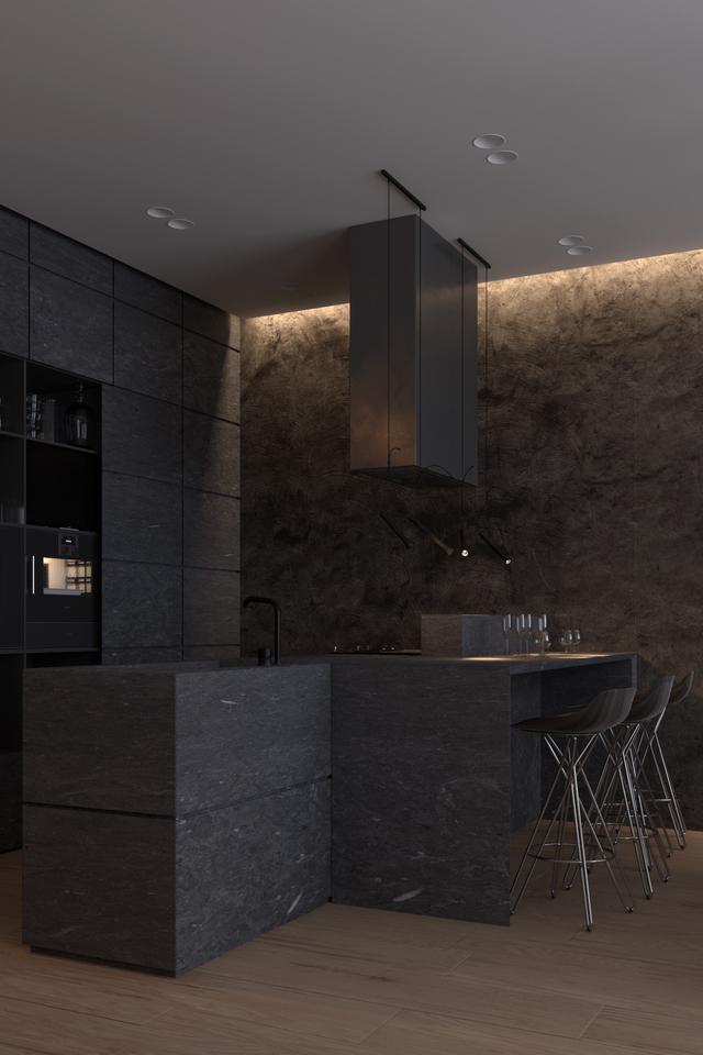 黑色和灰色的廚房幾乎消失在黑暗的背景中。正是紋理的變化定義了它。