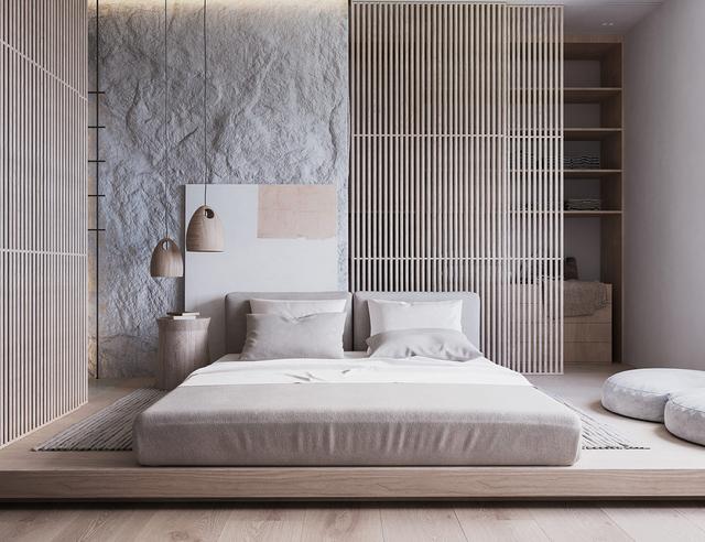同樣的紋理可以轉換到家里的任何房間。看看主起居空間的石頭和木頭板條百葉窗如何應用于臥室。