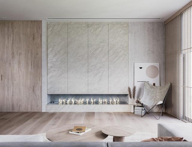 在客廳的另一側,一座現代化的壁爐在寬大的大理石壁爐胸中明亮地燃燒著。注意他們是如何用原始的混凝土背景和一些溫暖的木板來抵消冰冷的大理石效果的。