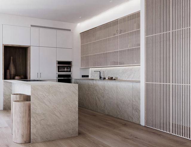 知道什么時候使用紋理,什么時候控制它。廚房的盡頭是木質和大理石相間的廚房,一面白色的墻面用白色的門偽裝起來。通過壓制一些元素,你能夠使另一個元素更引人注目,比如這個木制的展示柜。