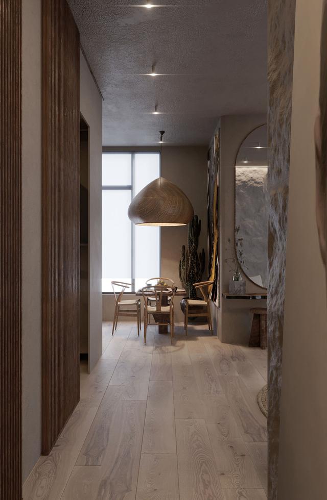 我們的第二個住宅案例位于烏克蘭基輔,總面積為50平方米。在這里,所有的墻都是完全不完美的,因為它們都是用有觸感的粘土建成的。設計師解釋說:"我們認為不完美的事物就是美。"這套公寓展現了自然的不規則和平靜,以及對自然材料和形狀的熱愛。