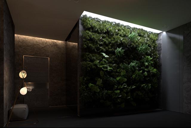 一盞落地燈將聚光燈投射在一小塊區域上,而天窗則投射出大量的光線,非常適合培育一個枝葉繁茂的垂直花園。