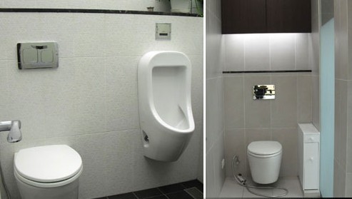 ??? 一般常見的馬桶皆采用此形式,水箱可見的優點是維修容易;另外安裝時要注意的是,若馬桶有移位,必須遷就管線將地板墊高15公分左右。