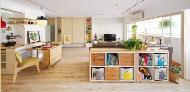 位于客廳沙發(fā)后面的存儲單元充當(dāng)了房間分隔器。后面的空間被用作一個舒適的閱讀角落。