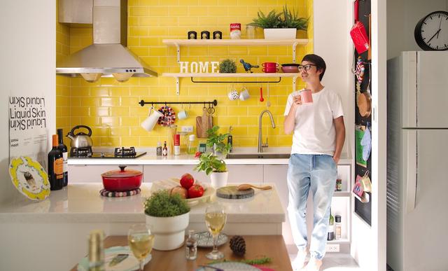 開放式的貨架提供了方便的存儲空間,并在黃色廚房中創(chuàng)建了隨意的墻面裝飾。
