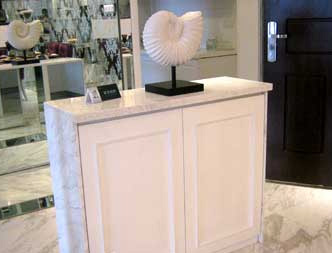??? 石材裝飾用品進(jìn)入家庭,更多的是制成各類家具的臺(tái)面,這就要考慮到污染問(wèn)題,因而要選擇顏色深一些的石材,像綠、藍(lán)、紅色系列的大理石、花崗石均可,大理石中那些帶有大花紋的品種,裝飾效果會(huì)更好些。