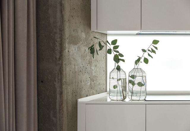 光滑的白色光澤的廚房裝飾與粗糙的混凝土窗戶墻形成對比。