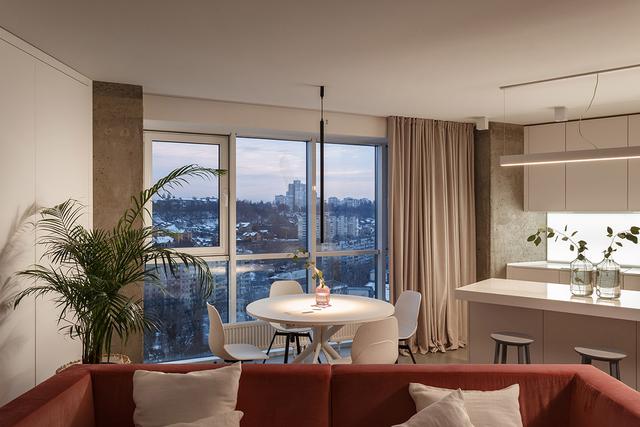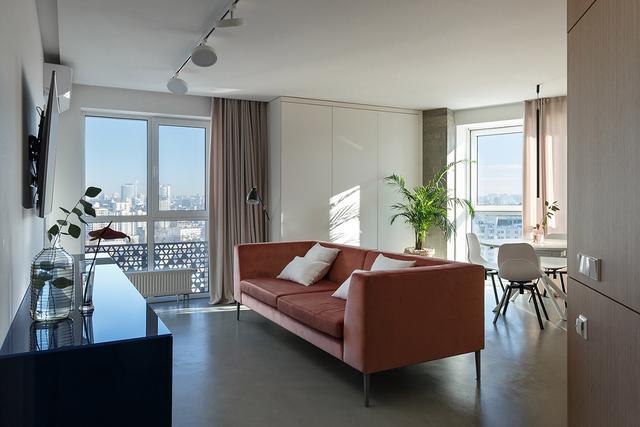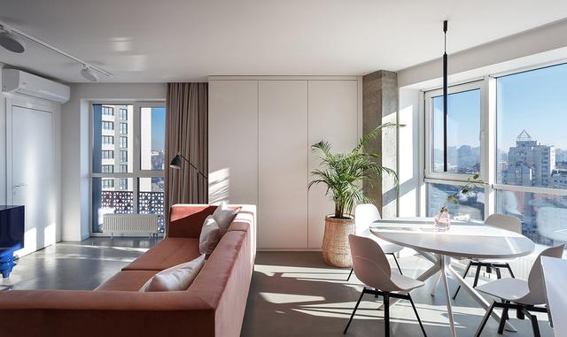 黎明和陽光是這個溫暖的公寓裝修設計的靈感源泉,由Svoya工作室將其命名為"神奇的早晨"。該團隊將注意力集中在早晨是一天中最特別的一段時間,并確保陽光出現在公寓的許多元素中。即使在小的入口大廳,盡管它與自然光隔絕,也有一個鏡面球來照射周圍的"陽光"。溫暖的黎明色彩的公寓,靈感來自日出,可以通過公寓的大窗戶觀察到它的輝煌;混凝土地板向灰色的城市景觀延伸。主臥里的一張定制床面向早晨的第一縷晨光。