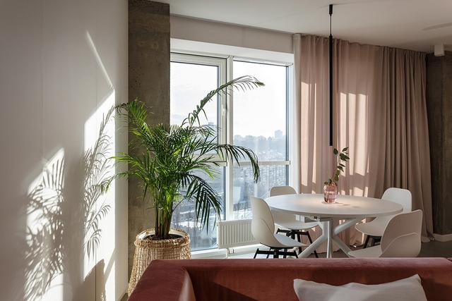 室內植物給城市公寓帶來了生機。一個大的試件軟化了原始混凝土柱的外觀;藤條花盆為整個設計增添了額外的溫暖和質感。一束綠色植物從餐廳餐桌中央伸出。
